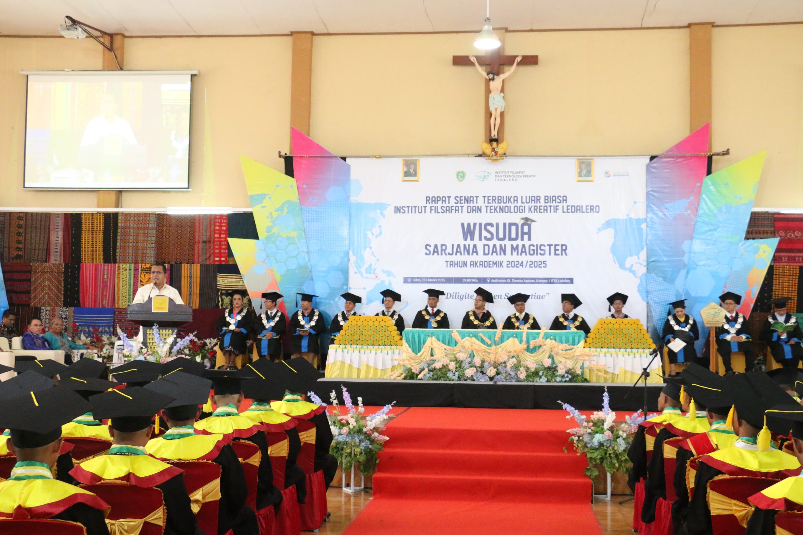 MAUMERE, terasntt.co — Gubernur NTT Melki Laka Lena, menghadiri Rapat Senat Luar Biasa Institut Filsafat dan Teknologi Kreatif (IFTK) Ledalero, Wisuda Tahun Akademik 2024–2025, di Aula St. Thomas Aquinas, Kampus IFTK Ledalero – Maumere, Kabupaten Sikka, Sabtu (25/10/2025). Gubernur mengapresiasi seluruh civitas akademika IFTK Ledalero atas dedikasi dan kontribusinya, mencetak Sumber Daya Manusia (SDM) unggul di bidang filsafat, keagamaan, dan teknologi kreatif, juga para wisudawan resmi diutus untuk berkarya di tengah masyarakat.