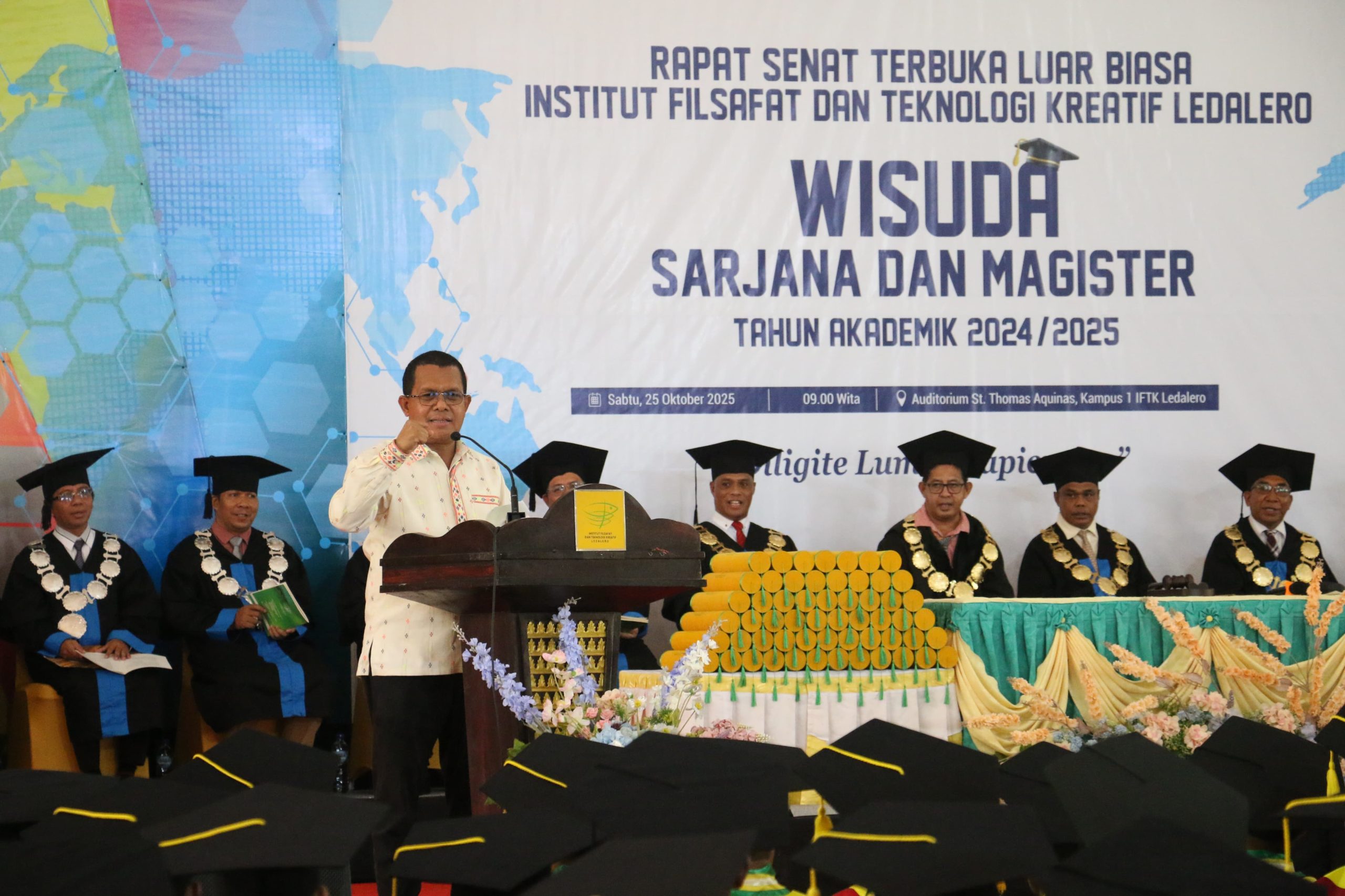 “Apa yang terjadi di Ledalero hari ini bukan sekadar kelulusan, tetapi perutusan. Wisuda di IFTK Ledalero adalah pernyataan iman dan nalar, bahwa terang kebijaksanaan dan ilmu pengetahuan harus dibawa ke seluruh penjuru dunia ke ruang akademik hingga kampung Nelayan, ke mimbar Gereja hingga forum publik,” ujar Gubernur Melki.