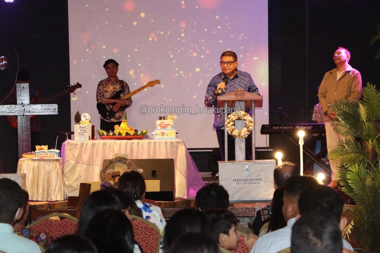 Penjabat Wali Kota Kupang, Fahrensy Priestley Funay, S.E., M.Si., saat menghadiri syukuran ulang tahun Sekolah Komunitas Kristen Tunas Bangsa (SKKTB) Kupang yang ke-27 sekaligus pembukaan Akademi Fisioterapi Tunas Bangsa Kupang di Victory Life House, Jl. Ahmad Yani Kelurahan Merdeka, Kota Lama, Kota Kupang, Minggu (10/3/2024).