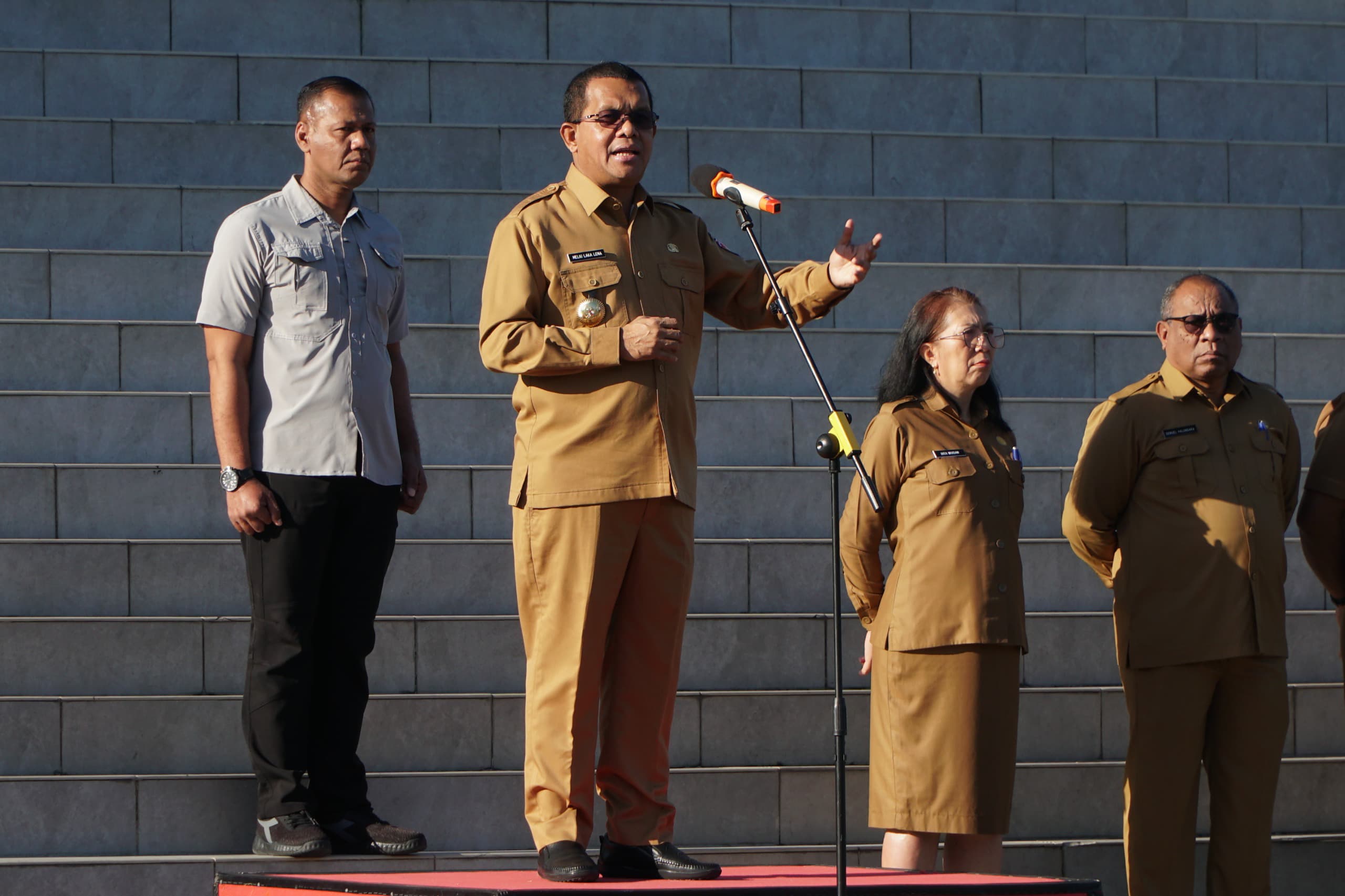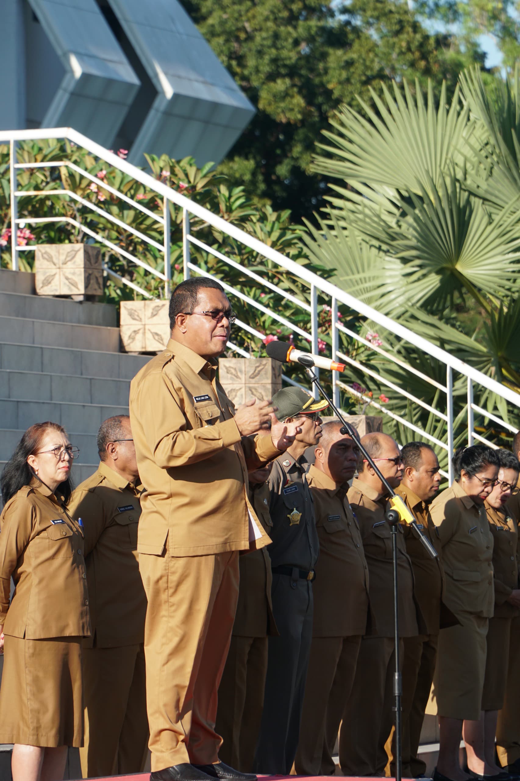 Gubernur NTT Melki Laka Lena saat memimpin apel di halaman gedung Sasando, Senin (23/6/2025)